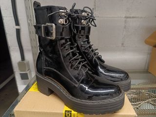 Botas de estilo militar con acabado charol brillante. Cuentan con detalle de hebilla y cierre de cordones. - Diseño de caña alta. - Suela gruesa y robusta.