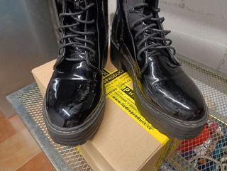 Botas de charol con cordones. - Cierre de cremallera. - Suela gruesa.