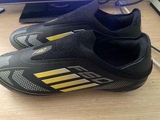 Botas de fútbol, talla 44, completamente nuevas. - Diseño sin cordones. - Combinación de colores negro y dorado. - Parte superior de tejido técnico.