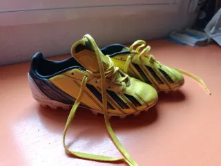 Botas de fútbol para niño de la marca Adidas en talla 32. Diseñadas para ofrecer buen agarre en el campo. - Color amarillo y negro. - Cierre con cordones.