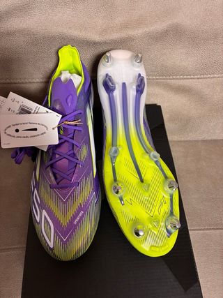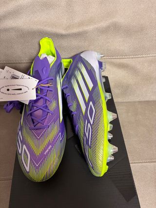 Botas de fútbol Adidas F50 Elite SG en llamativos colores morado y verde neón. Diseñadas para un rendimiento óptimo en campos de césped natural húmedo. - Modelo F50 Elite. - Suela SG (Soft Ground). - Diseño Sprintweb.