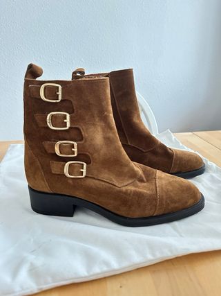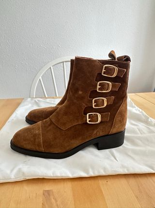 Botín de piel ante en color marrón, sin estrenar. Cellido al tobillo. Muy elegante. Boutique Olarra San Sebastián. - Cierre con tres hebillas doradas. - Detalle de tira en la parte trasera. - Tacón bajo y cuadrado. - Cierre cremallera