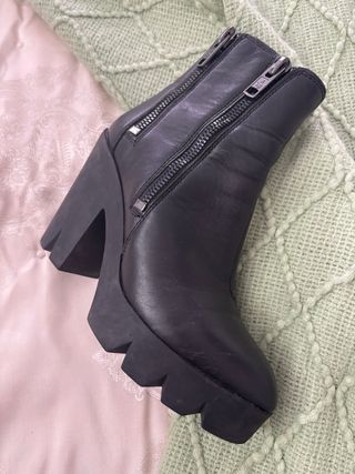 Botines de piel con un diseño moderno y detalles de cremallera. - Material: Piel. - Cierre: Cremallera lateral. - Tacón grueso y plataforma. el precio original fue de 280 euros . las use dos veces únicamente por subí de peso y se me ensanchó el pie. son muy lindas y con un diseño de la suela muy retro pero elegante!! Están forradas con piel de vaca también por dentro.