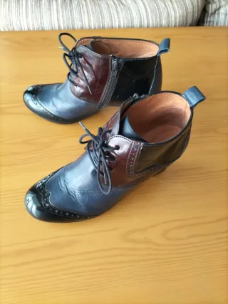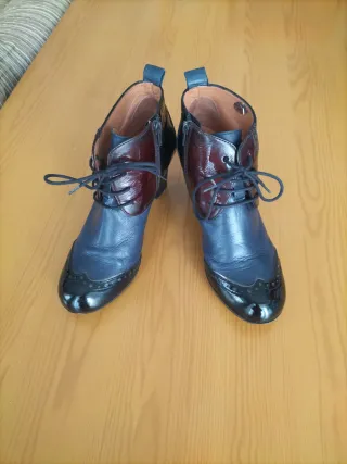 Botines de tacón con un diseño tricolor y cordones. - Combinación de piel azul, burdeos y negro - Detalle de picado en la puntera. - Cierre lateral con cremallera. Puestos una única vez, mucho tacón para mí (8,5 cms.)