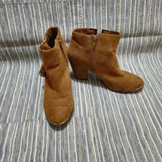 Botines de ante color marrón, talla 38. - Diseño de caña baja. - Cierre de cremallera lateral. - Detalle de borla en la cremallera. - Tacón grueso. - Puntera con detalle metálico.