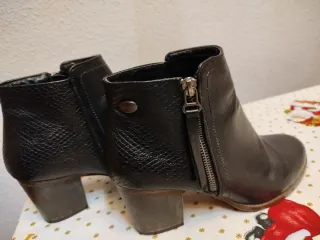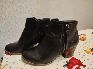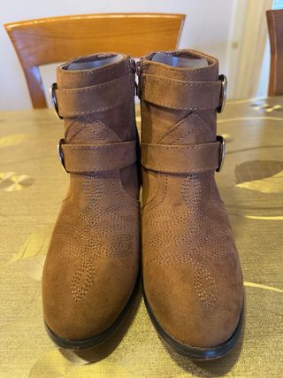Botines de ante en color marrón con detalles en negro. Cremallera en parte posterior. Están sin estrenar. Equivalente a talla 39, dan mucha talla. - Cierre con cremallera trasera. - Tacón bajo y cuadrado. - Punta cuadrada.