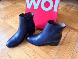🆕 Estado: Nuevo / a estrenar. 🆕 Botín elegante de piel auténtica (caña baja) con detalle de hebilla metálica en el talón. Tacón ancho estable y suela con grabado antideslizante para un uso cómodo todo el día. Ideal para oficina y looks casual chic. Características: - Color: azul marino. - Material exterior: 100% piel; plantilla acolchada. - Cierre: cremallera lateral. - Tacón: bloque aprox. 5–6 cm con detalle metálico. - Suela: goma antideslizante. - Talla 39. 📦 Entrega en Aluche o envío disponible.