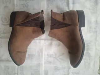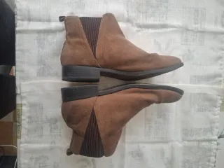 Botines de ante en color marrón. - Diseño de caña baja. - Punta fina. - Detalle elástico lateral. Precio original 99,95€