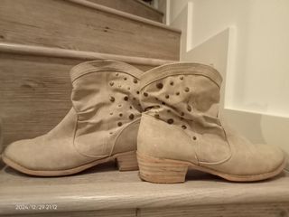 Botines cortos de estilo western con un diseño moderno y detalles de tachuelas. - Diseño de corte en V. - Adorno de tachuelas plateadas. - Tacón bajo. - Talla 40, pero parece un 39. Por eso nunca se usaron,me venian muy pequeñas.