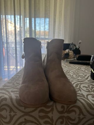 Botines de estilo casual en color beige, perfectos para complementar tu atuendo. - Cierre de cremallera lateral. - Detalle de adorno metálico en la cremallera. - Tacón bajo y cómodo. - Material de ante sintético.