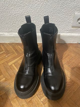 Botines de la marca Bershka en talla 38, completamente nuevos. - Diseño moderno y llamativo. - Acabado brillante. - Cierre con cordones y cremallera lateral.