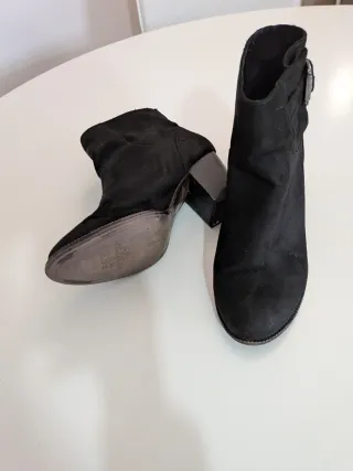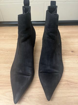 Botines de estilo moderno. - Material exterior tipo ante. - Punta fina. - Tacón alto. Le faltan las tapillas del tacon