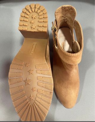 Botines de tacón de la marca Bershka. - Material de ante. - Diseño abierto en la parte superior. - Cierre con hebilla. - Suela de goma con diseño. - Tacón grueso.