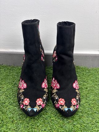 Botines Bershka en color negro, efecto ante, con bordado floral multicolor muy elegante y original. Tacón ancho y cómodo, ideal para uso diario o para darle un toque especial a cualquier outfit. Cierre con cremallera lateral. En muy buen estado (ver fotos). 🍂 Ideales para otoño e invierno ✨ Cómodos, femeninos y fáciles de combinar