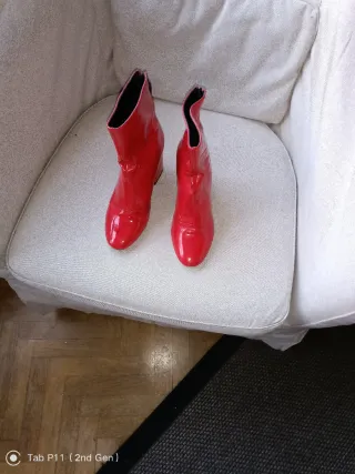 Preciosos botines de charol en color rojo vibrante de Bershka. Tienen un tacón ancho que los hace súper cómodos para aguantar todo el día o salir de fiesta. Talla: 36 Estado: Muy buen estado general, el charol brilla muchísimo. Detalle: Tienen un pequeño roce en la cara interna (ver última foto). Puestos no se nota nada y de ahí su precio tan reducido. Estilo: Ideales para darle un toque de color a cualquier look básico.