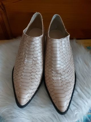 Botines de bimba y lola de piel de color beige, con estampado efecto serpiente. Usados, pero con mucha vida aun. Mirar bien las fotos, todos los defectos se muestran en ellas. Talla 40