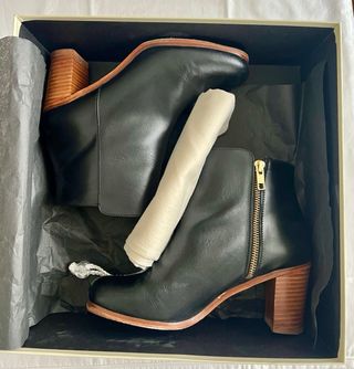 Botín de piel vacuna, color negro, con tacón madera de 6,5cm. Número 37. Cremallera lado interior. Punta cuadrada. Usado dos veces. Perfecta conservación. Guardalpolvo y caja. Precio de compra: 160€.