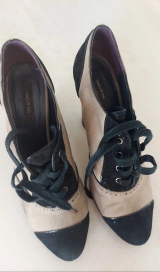 Preciosos botines de la marca BIMBA Y LOLA. Son de color beige y negro, y tienen un diseño elegante y sofisticado. Ideales para cualquier ocasión. - Material de ante y piel. - Cierre con cordones.