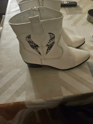 Botines estilo cowboy con un diseño llamativo. - Combinación de blanco y dorado. - Detalle de bordado en la caña. - Punta afilada. - Tacón curvo. Botines estilo cowboy con un diseño llamativo. - Combinación de blanco y dorado. - Detalle de bordado en la parte dorada. - Tacón negro angulartiene un desperfecto en el tacón por la parte interna de haberlo usado pero no se aprecia prácticamente