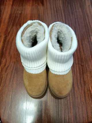 Preciosos botines de ante (suède) en color camel/tostado. Tienen un diseño tipo "biker" con hebilla lateral decorativa que les da un toque con mucha personalidad. Lo mejor es el interior: están totalmente forradas de pelo/lana blanca, por lo que son ultra calentitas y cómodas para los días de frío. Estado: Muy bueno (puedes especificar si tienen poco uso). Material: Exterior de piel vuelta/ante y suela de goma robusta con buen agarre (anti-deslizante). Estilo: Ideales para combinar con vaqueros, leggings o incluso vestidos