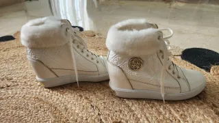 Botines de piel de la marca Guess, con un diseño elegante y moderno. - Color blanco con detalles dorados. - Forro interior de pelo para mayor comodidad. - Suela de goma. - Cierre con cordones.