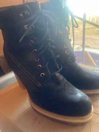 Preciosos botines con un diseño moderno y llamativo. - Cierre principal con cordones. - Cremallera lateral para facilitar su uso. - Tacón grueso y plataforma delantera.