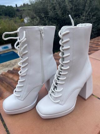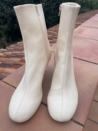 Botines de tacón en color blanco roto, con un diseño moderno y elegante. - Tacón 11 cm grueso y plataforma. - Detalle de pespuntes verticales en la caña. - Cremallera lateral para facilitar su uso. - Tirador trasero. Usados 1 sola vez en evento Envío por correo certificado previo pago de tasas y producto por Bizum en el momento del envío