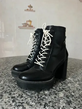 Botines altos negros, cordones blancos, talla 36