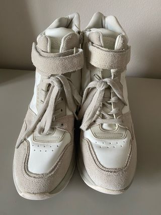 Zapatillas deportivas tipo botín con cuña. Combinan detalles en piel y ante. - Cierre con cordones. - Correa de velcro en el tobillo. - Detalle de cremallera lateral.