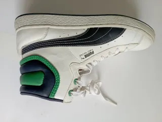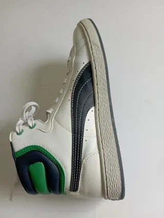 Botines Puma de estilo deportivo, combinando blanco con detalles en verde y azul marino. - Diseño bicolor. - Cierre con cordones blancos. - Detalle de costuras.