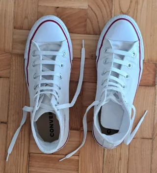 Botines Converse de estilo casual. - Diseño clásico con detalles en negro. - Cordones blancos para un ajuste seguro. - Suela de goma blanca.