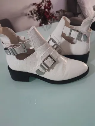 Botines blancos con un diseño moderno y detalles de hebillas. - Acabado texturizado tipo piel de cocodrilo. - Cierre con hebillas metálicas. - Corte abierto en los laterales. - Tacón bajo y cómodo.