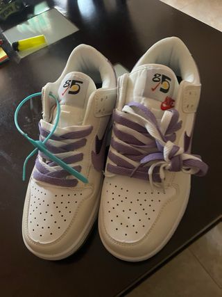 Botines Nike con detalles en morado y blanco. - Diseño con cordones. - Etiqueta con logo '85' en la lengüeta. - Swoosh lateral en morado.