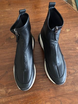 Botines tipo bamba con un diseño moderno y detalles en plateado. De piel y tela elástica muy chulos y muy cómodos y apenas usados porque me van grandes. - Cierre de cremallera frontal. - Detalle plateado en la parte trasera. - Suela blanca con detalles plateados.