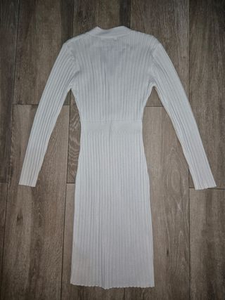 Vestido de punto acanalado marca Hawiton, color crema/blanco roto, talla M. Tejido suave y elástico, se adapta al cuerpo y resulta muy cómodo. Diseño elegante con cuello en V y botones decorativos, manga larga y punto vertical que estiliza la figura. Largo tipo midi ideal para otoño e invierno. Perfecto para combinar con botas o botines y crear looks elegantes o casual. Medidas ⚠️aproximadas⚠️ talla M • Pecho: 86–94 cm • Cintura: 68–76 cm • Largo: 100–105 cm • Manga: 57–59 cm Usado solo 1-2 veces Entrega en mano o envío (se grabará el proceso de embalaje y envío en la oficina de Correos)