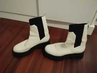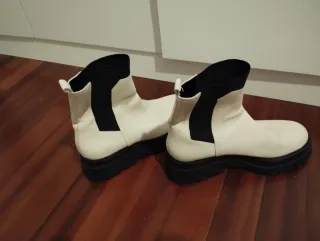Botines de Stradivarius en talla 38. Combinan blanco y negro con suela gruesa. - Diseño tipo chelsea. - Paneles elásticos laterales. - Puntera redonda.