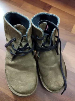 Botines de ante en tono marrón, perfectos para un estilo casual. - Cierre con cordones negros. - Interior forrado para mayor comodidad. - Suela de goma.