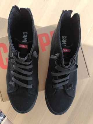 Botines negros Peu Senda de Camper, talla 35. ** NOTA** Son muy justos para una 35 normal, miden 22cm. Personalmente aconsejo más para una talla 34 o 34.5. De piel porcina, muy flexibles y cómodos. Goma en punteras y trasera, así como en la suela (antideslizante). En excelente estado, prácticamente nuevas. apenas están usadas. Tengo un problema en el pie, que me impide usar calzado plano y ya no los puedo usar. **"ver foto Camper de modelo similar. Nuevas cuestan cerca de 120€ ### PRECIO NO NEGOCIABLE ###