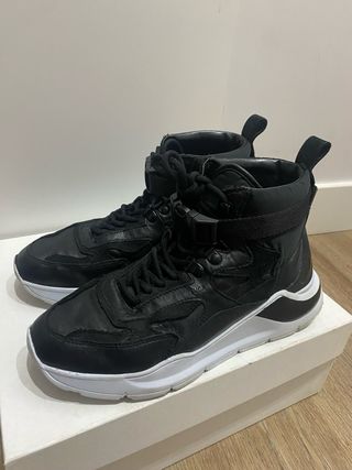 preciosas zapatillas tipo botín negras con cordones y cinta con cierre . talla 40 . en las ultimas 3 fotos se ven minimos desperfectos en la pintura de la suela .