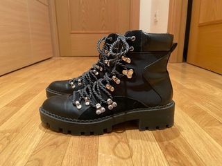 Zapatos negros con cordones y suela gruesa. Apenas usados. Los habré utilizado 2 o 3 veces. Piel sintética, veganos. - Diseño tipo botín. - Ojales metálicos para los cordones. - Tira en el talón para facilitar el calce.