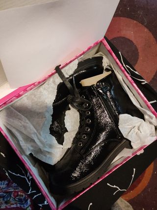 Botines negros tipo charol, con cremallera y cordones. Están nuevas sin estrenar. Tengo en mi perfil otras iguales blancas,sin estrenar también. Se pueden ver en mi perfil, tengo más botas y prendas.
