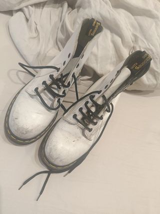 Botas Dr. Martens modelo 1460 originales, en color blanco con costura amarilla y cordones negros. Usadas pero en buen estado general, con señales de uso visibles pero limpias y listas para seguir dando guerra. Son cómodas, resistentes y perfectas para cualquier estilo, tanto urbano como alternativo. Con suela AirWair clásica de la marca: cómoda, antideslizante y duradera. Talla: 38.5 Motivo de la venta: ya no las uso. ¡Edición blanca muy buscada y combinable! 🛠️ Envío rápido y bien empaquetado. - Talla 38.5 - Material de cuero.