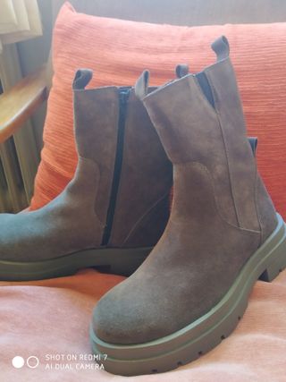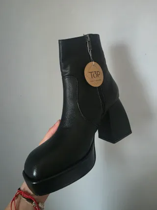 Botines talla 39 aunque pueden dar para una 40. Tacón de unos 9cms aprox. Plataforma. Súper cómodos. Un básico para tu armario. - Material: Piel vuelta. - Cierre: Cremallera lateral.