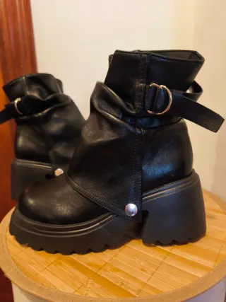 Botines negros con plataforma y detalle de hebilla. - Diseño con solapa y cierre de hebilla. - Plataforma gruesa con suela dentada. - Acabado en piel sintética. Nuevos a estrenar! Los vendo por error de talla. Tamaño de pie 24.5cm Son preciosos y súper cómodos!