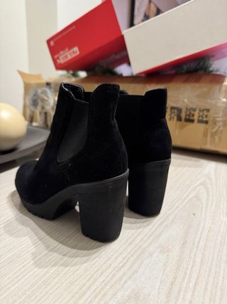 Elegantes botines de tacón con un diseño moderno. - Material exterior tipo ante. - Tacón grueso y plataforma. - Cierre de cremallera lateral. - Detalle de tira decorativa.