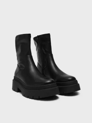 Botines de media caña con suela gruesa. - Diseño chelsea con paneles elásticos laterales. - Tiradores en la parte superior para facilitar su puesta. - Suela de goma con plataforma y buen agarre.