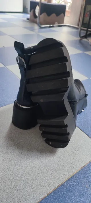 - Diseño de caña alta. - Tacón grueso y suela dentada. Botines negros de plataforma con suela chunky / track, muy cómodos . Tacón ancho. Talla:39 Estado: como nuevas puestas una vez Estilo: #urbano #chunky #botasnegras #suelatrack