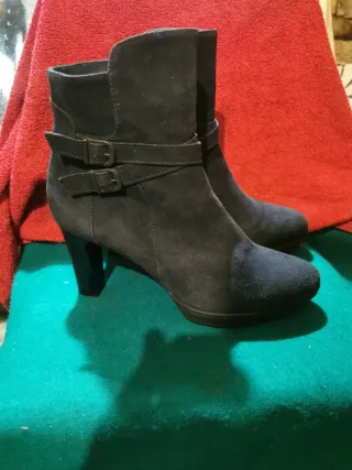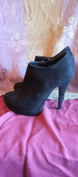 2° mano vendo botines marca Marypaz, de ante color negro, muy elegantes, Cremallera lateral, tacón de aguja de 9,5 cm y plataforma de 2,5cm. Gastos de envío no incluido en el precio.