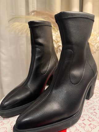 Botines de efecto piel en color negro. - Diseño con plataforma. - Tacón grueso. Talla 38. Es un poco estrecho en los tobillos y tiene efecto calcetín a la hora de ponérselo, pero es así el modelo. Utilizadas una sola vez, las vendo porque definitivamente no sé andar en tacones 😂 El precio original es 35,99€