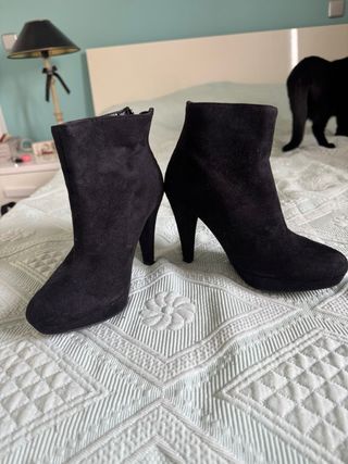 Botines de tacón alto con plataforma. - Material exterior tipo ante. - Cierre con cremallera lateral. - Tacón fino y estilizado. Su uso ha sido de 1 vez